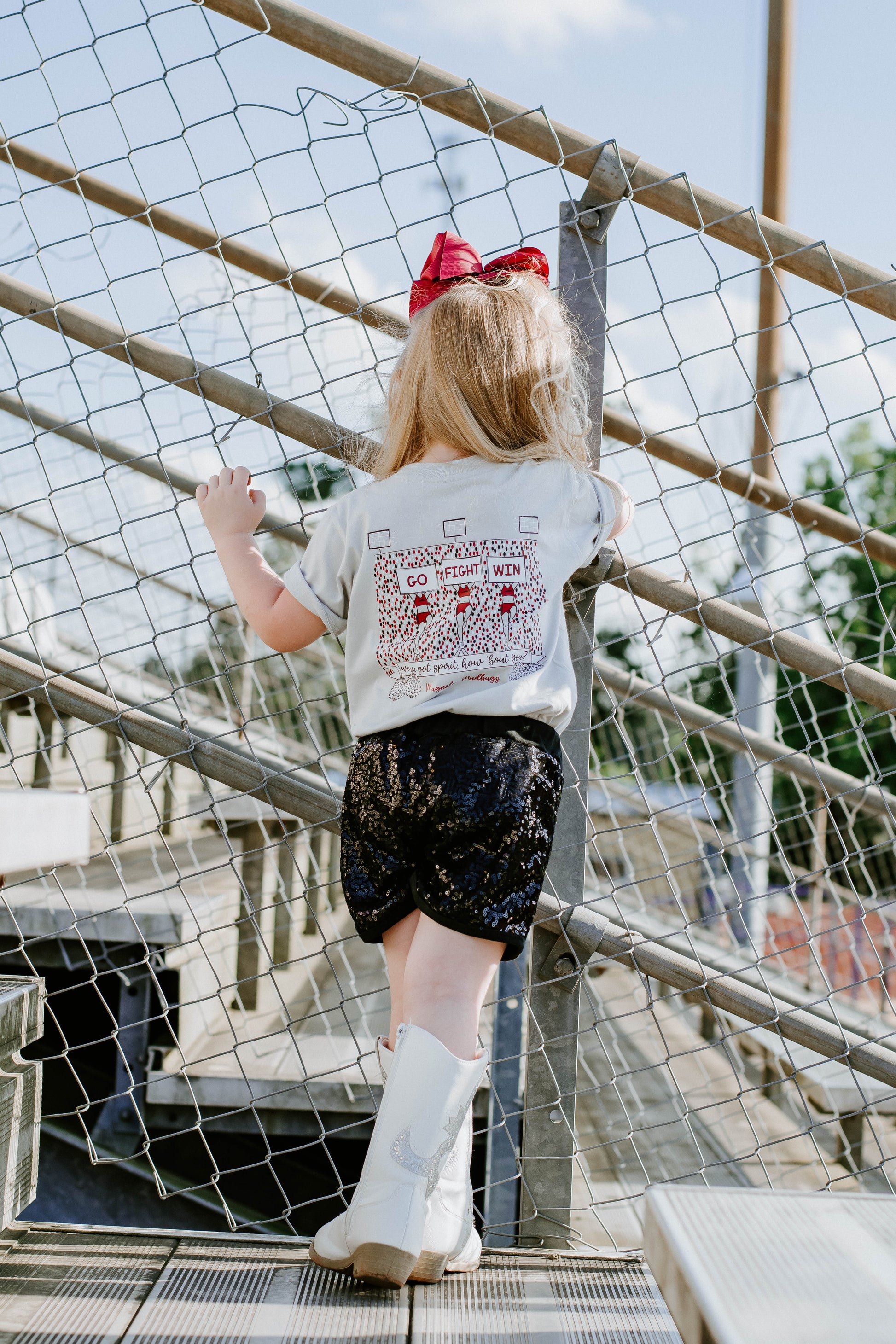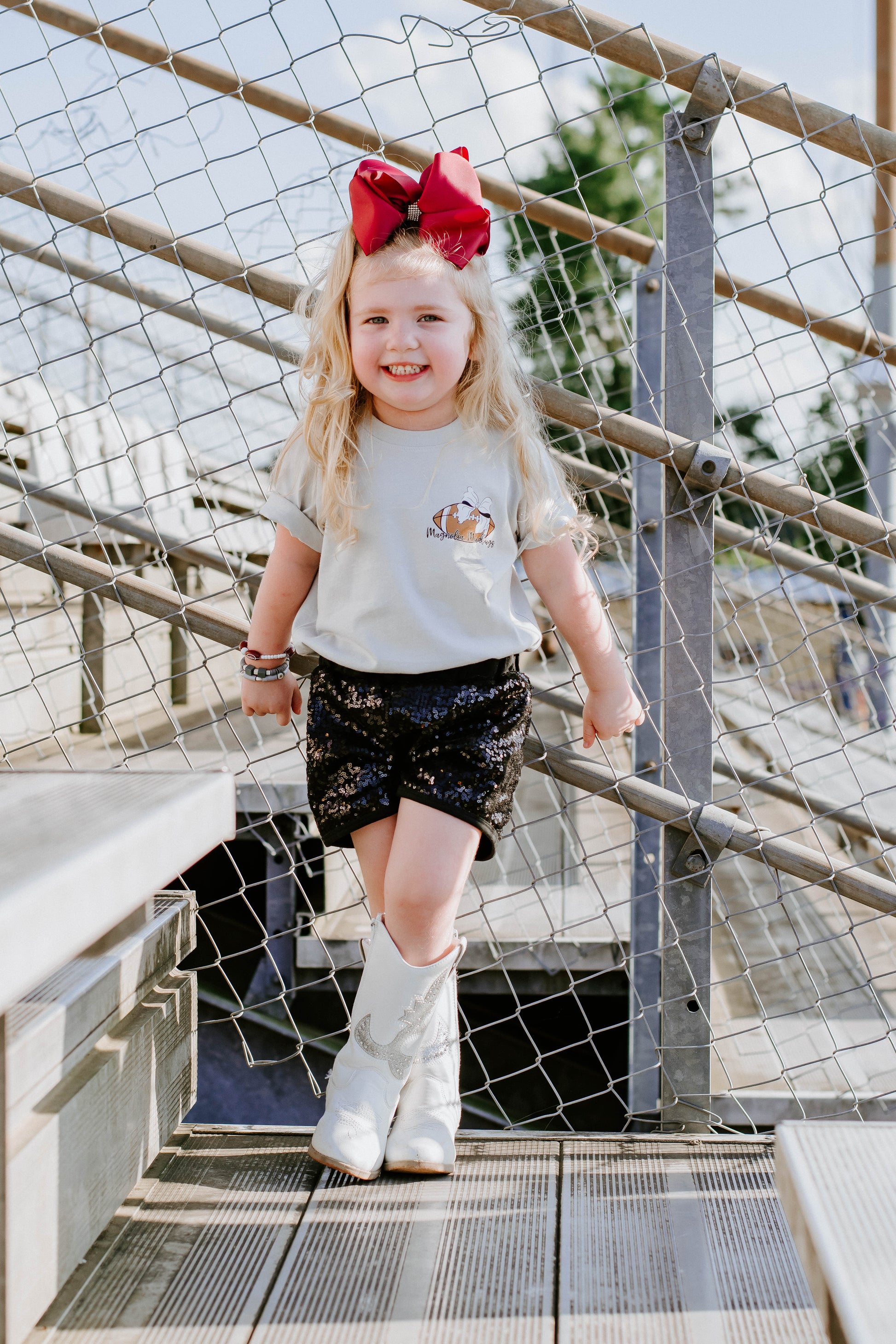 Turn heads on game day with these stunning black shorts covered in sequins front and back. Designed with a comfortable elastic waistband and fully lined for ease of wear. They fit true to size, combining style and comfort effortlessly! Toddler-Youth sizes available.