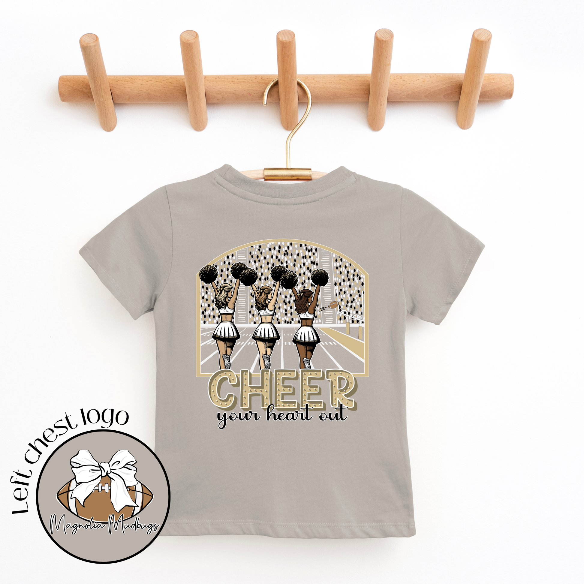 Cheer your heart out! Design features a silver-colored tee with black, white, and gold accents and showcases cheerleaders in a stadium full of fans. This is a back design with a matching specialty left chest logo on the front.