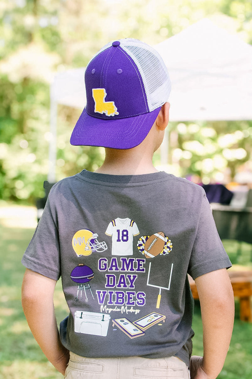 Show off your Louisiana pride with this purple and white youth trucker hat featuring an embroidered yellow Louisiana patch outlined in white thread with our signature Magnolia Mudbugs leather logo patch on the side. Designed to fit kids roughly ages 2 to 10, it features an adjustable snapback closure and a curved brim for comfort and style. The mesh back panels and embroidered eyelets keep little heads cool and breathable, making it perfect for active days.
