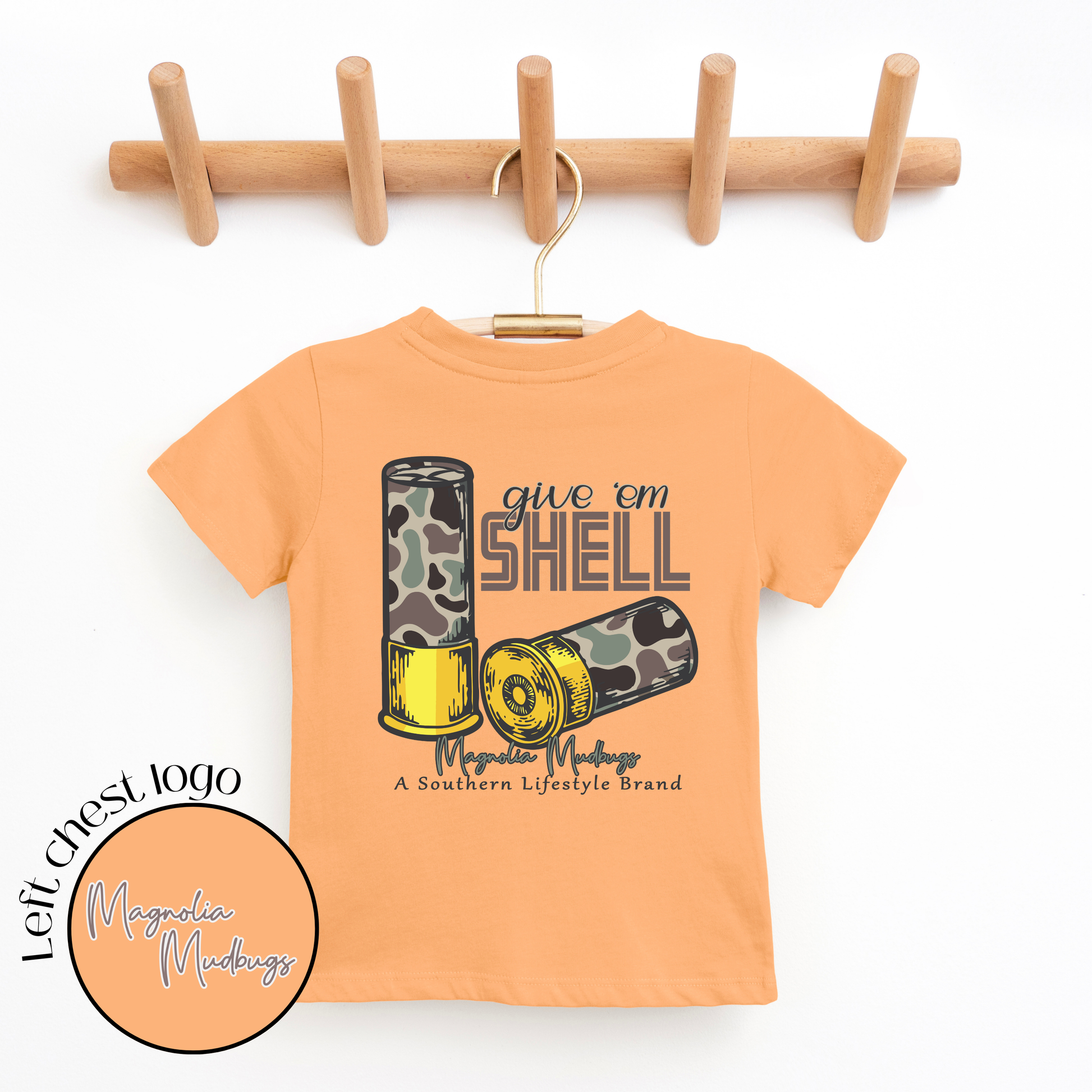This back design features camouflage shotgun shells accompanied by the clever phrase "give 'em shell," paired with our signature brand logo on the left front chest. Available in a dark heather long sleeve tee or a sunset-colored short sleeve tee.