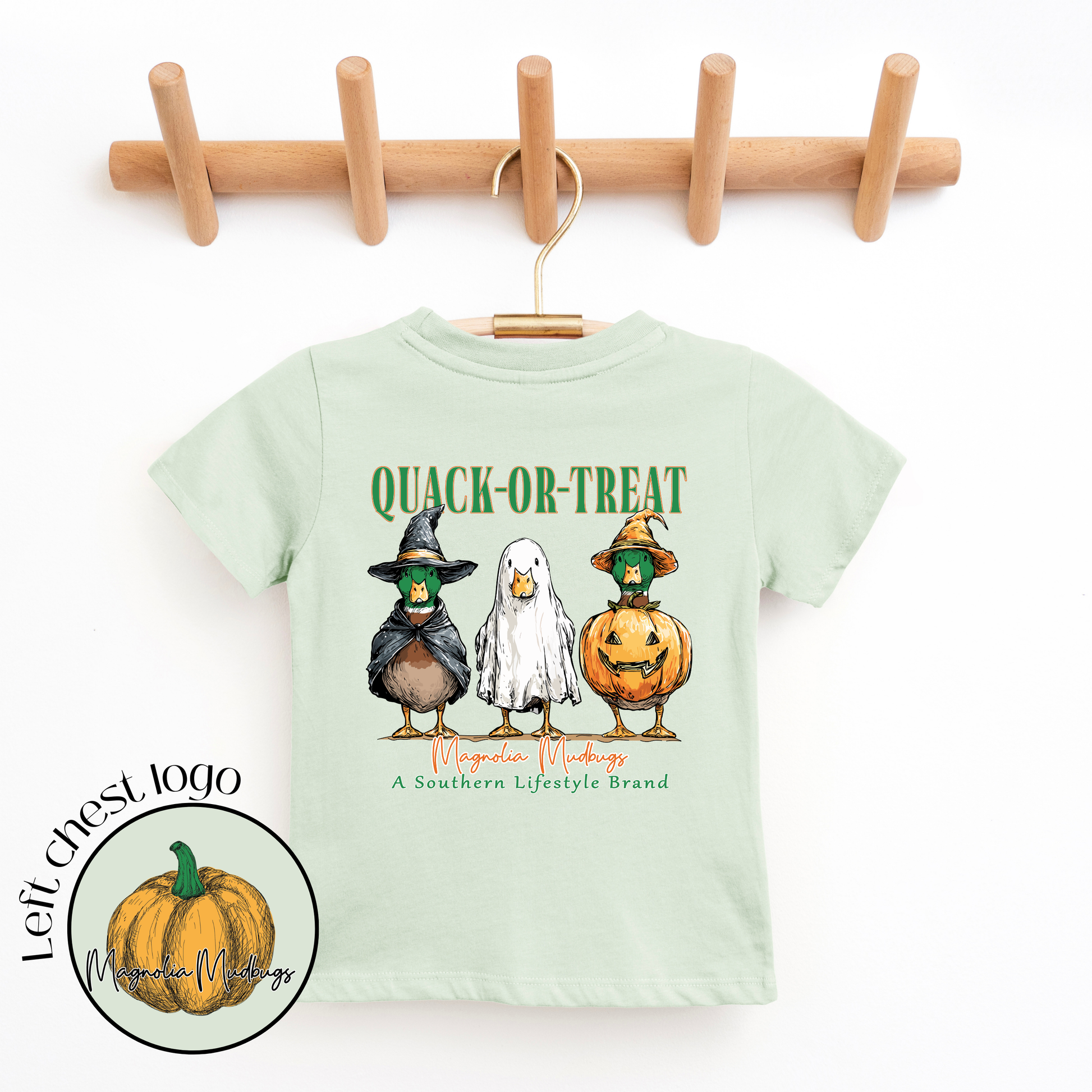 Celebrate the season with this unique blend of ducks and pumpkins—two iconic Fall favorites. The design showcases three ducks sporting their Halloween costumes. Choose between a short-sleeve honey-dew tee or a long-sleeve chill option for a stylish Halloween look.