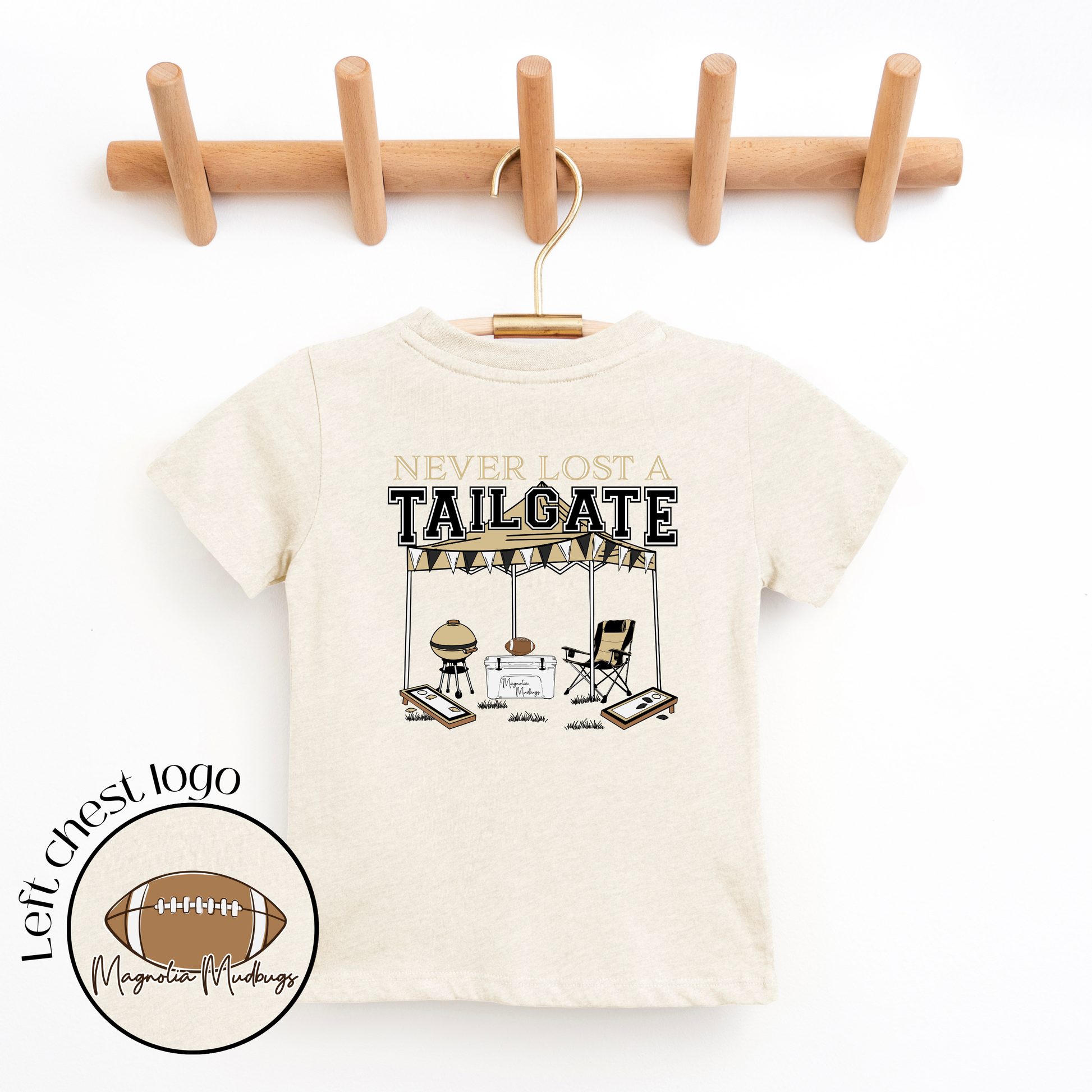 Never lost a tailgate! Design features a natural heather-colored tee with black, gold, and white. This is a back design with a matching specialty left chest logo on the front. Available in sizes 2 Toddler through Youth Large (14/16). 100% Combed Ring-spun Cotton. Short Sleeve - Toddler Unisex Fit. Now includes hangtag for easy boutique pricing! Please allow 3 to 6 weeks for delivery, although most orders ship sooner.
