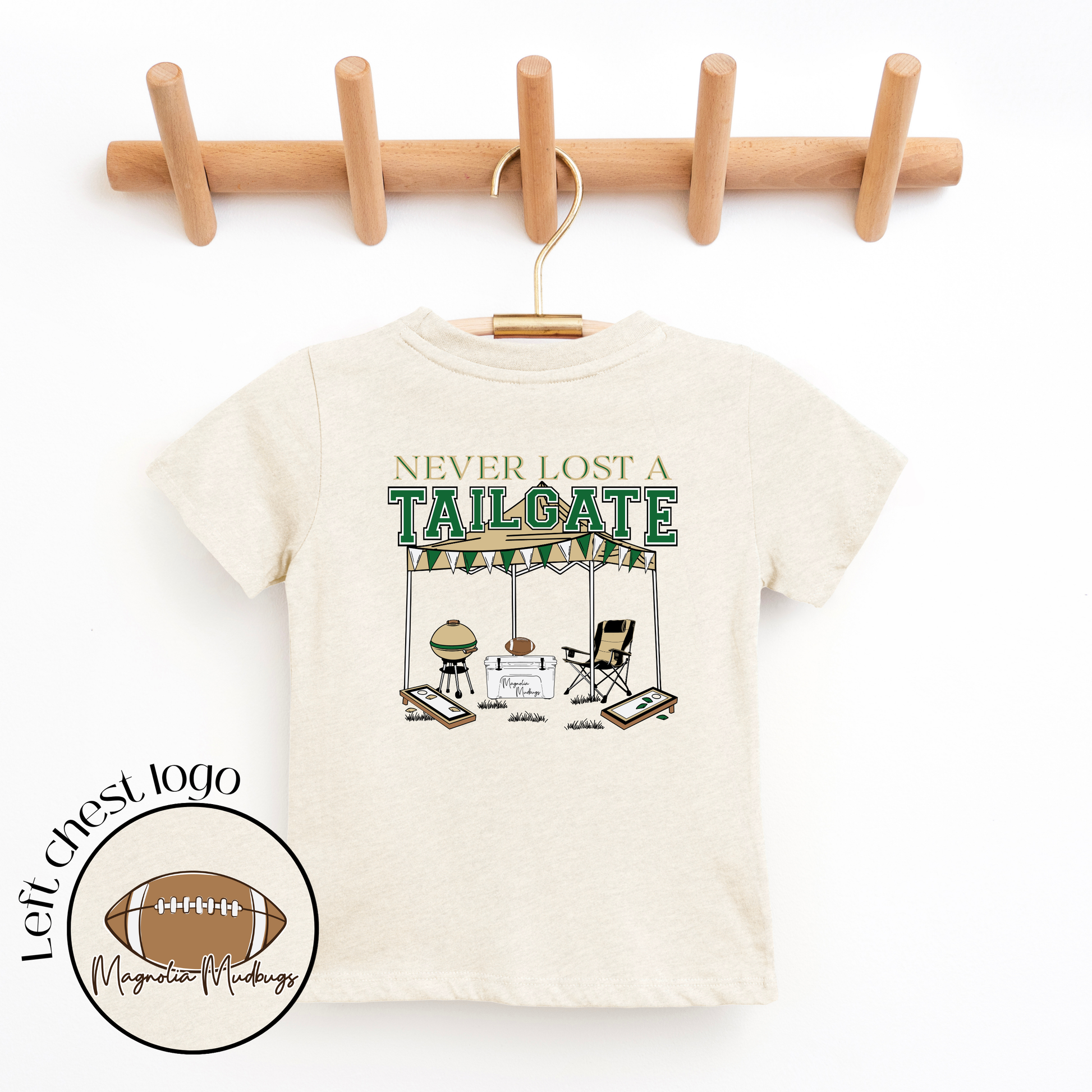 Never lost a tailgate! Design features a natural heather-colored tee with green, gold, and white. This is a back design with a matching specialty left chest logo on the front.