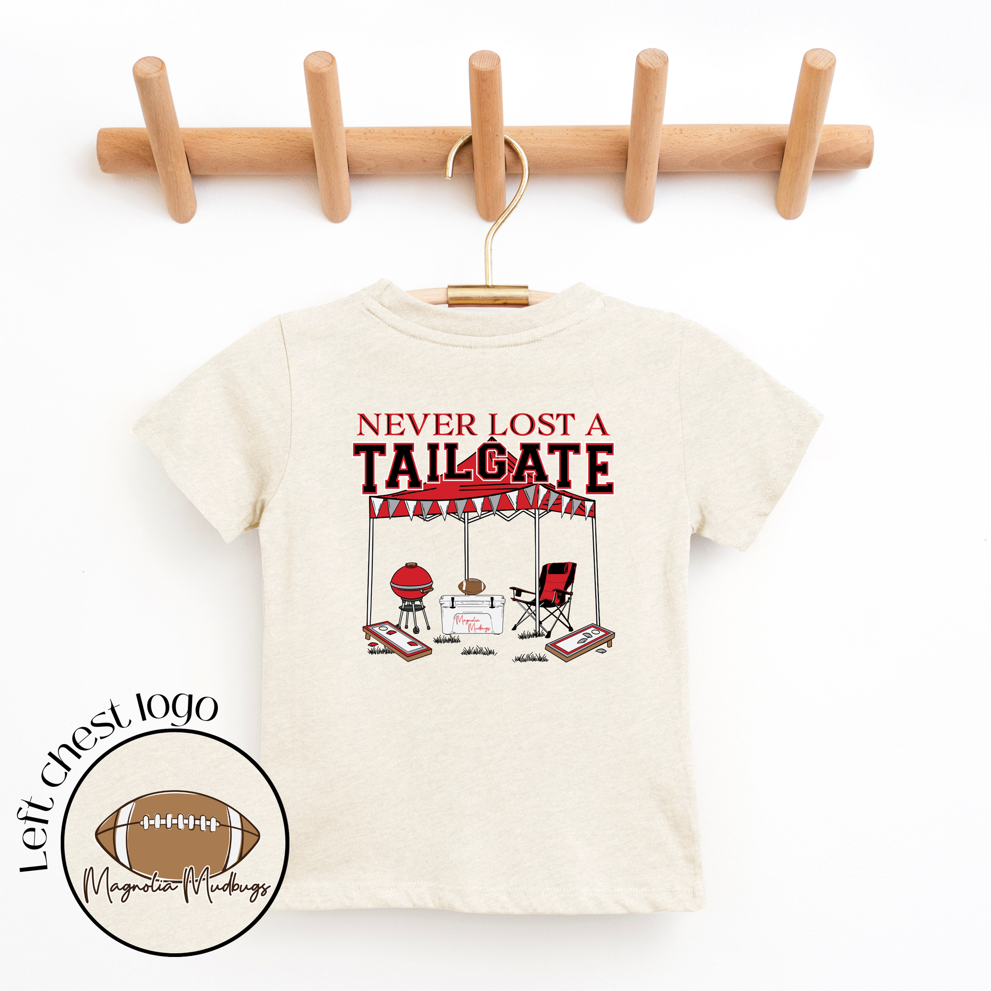 Never lost a tailgate! Design features a natural heather-colored tee with red, black, and white accents. This is a back design with a matching specialty left chest logo on the front.