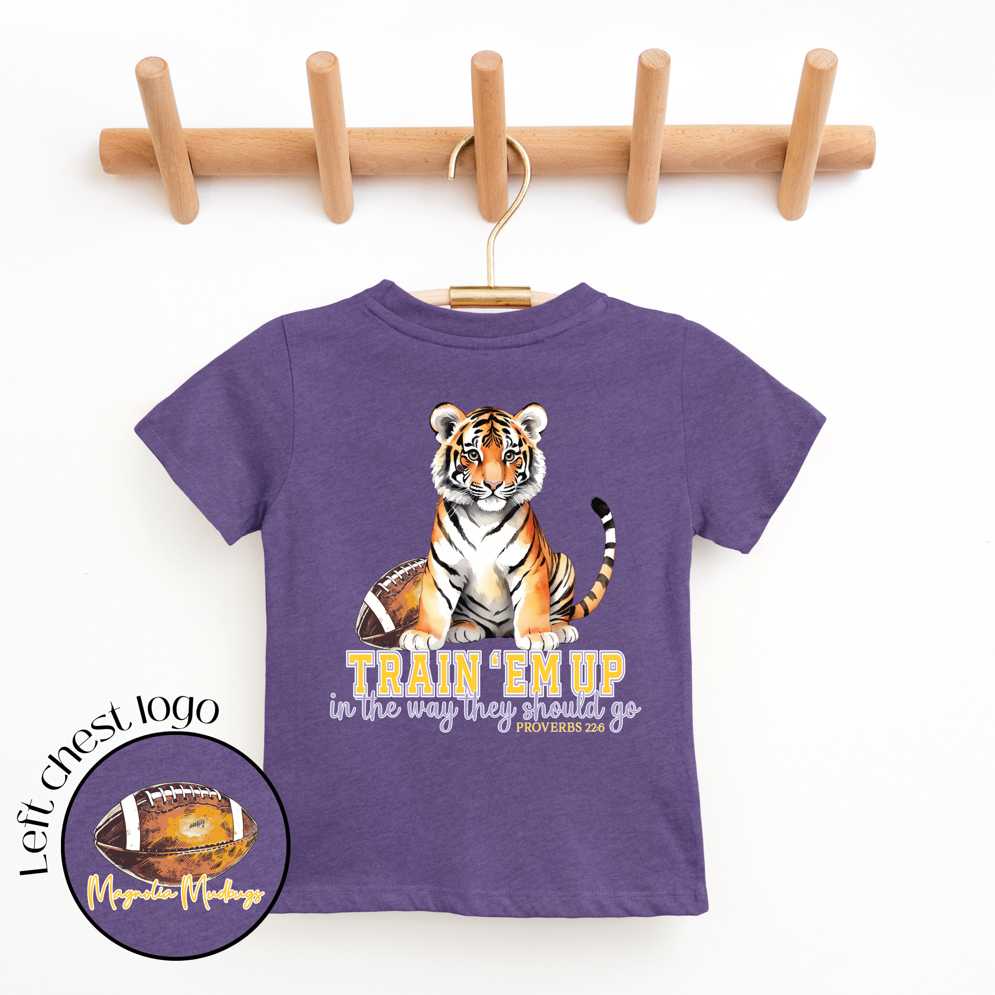 *PREORDER* Train up a Tiger | Football Kid’s Tee | Purple + Gold